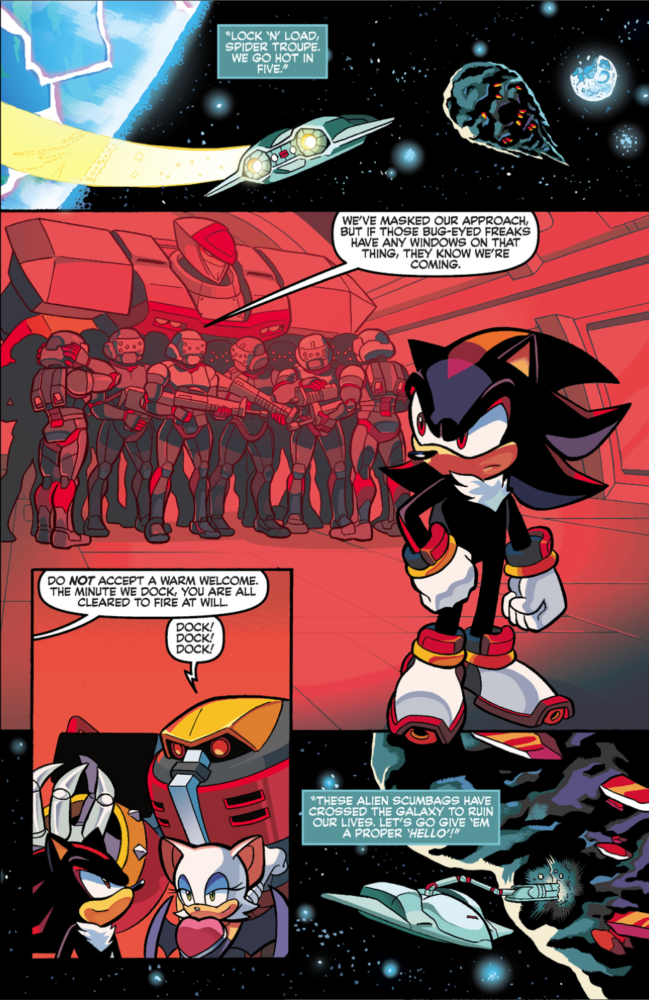 Этот мужик есть самый благородный и заботливый представитель официальных стаффов что я припоминаю, то, как он старается во благо нашей фэндомской кучи, это в сто раз больше чем любые усилия этой большой корпорации Сеги во имя лицемерного фансервиса. И да, прочел последний выпуск, и весь выпуск визжал как 5-летняя девочка, от прекрасной сегасониковской рисовки Ярдли, от замечательных диалогов Яна, и от отличных идей в стилистике и дизайне. Я уже начинал сам чувствовать легкий дискомфорт от прошлых частей этой арки и от старта Падения Шедоу в Юниверсе, но теперь мои ожидания оправдались, и я вижу что Ян пережил тяжелый переворот и вернулся в свою стезю качественного экшена, диалогов и идей. И сегодня я наконец-то определился со своим впечатлением от сеганизированных борцов за свободу - я скажу что я в восторге, ибо под термином сеганизации вышло именно то, старое доброе из игр СА эры, дизайны, стиль и навыки персонажей теперь соответствуют стандартам тех самых любимых игр и дизайнов от Юджи Уикавы, боевые браслеты Салли в стиле апгрейдов САшек это вообще что-то гениальное, Сэл прибавила несколько уровней харизмы в моих глазах. ...Хотя может это потому что у меня фетиш на синий цвет и лезвия из рук...