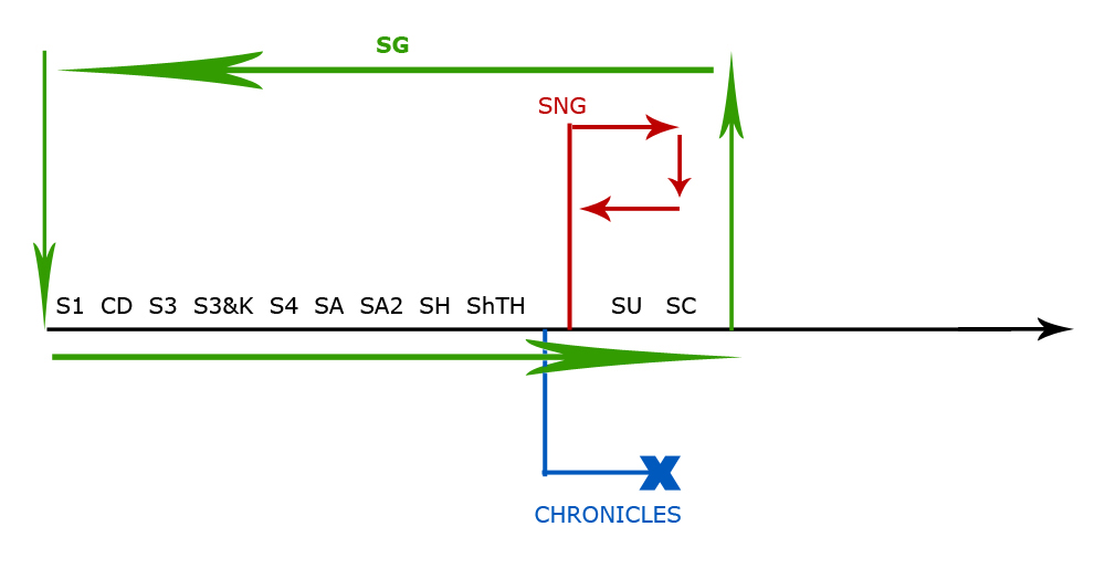 Spyro the dragon 295 Опубликовано: 2 июля, 2011 (изменено) Меня заинтересовала тема с линией времени, и я решила вставить свои пять копеек. Чёрный цвет — основная ветка. Красный цвет — SNG, цикличное событие, исходящее из одной точки в некоторое будущее, а затем снова возвращающееся в эту точку. Альтернативная замкнутая ветка. Синий цвет — Sonic Chronicles, альтернативная оборвавшаяся ветка. В принципе, существование Хроник тут под вопросом, так как тут идёт уже полноценное разветвление, в отличие от СНГ, где всё же события вернулись в начальную точку и основная ветка продолжилась дальше... Зелёный цвет — Sonic Generations, событие, которое охватывает всё прошлое и затем опять возвращается в точку своего начала в будущее. Оно затрагивает СНГ, но не Хроники. Изменено 2 июля, 2011 пользователем Spyro the dragon Поделиться сообщением Ссылка на сообщение