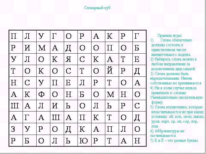 hog12 32 Опубликовано: 23 июля, 2005 (изменено) Вот такая байдовина для распечатки на принтере. Настоятельно рекомендую прежде чем играть в эту затейливую вещь ознакомится с правилами игры. Найдите как можно больше слов в большом 100-клеточном квадрате. Выкладывайте свои результаты, мой же личный рекорд - 92 слова. Изменено 23 июля, 2005 пользователем hog12 Поделиться сообщением Ссылка на сообщение